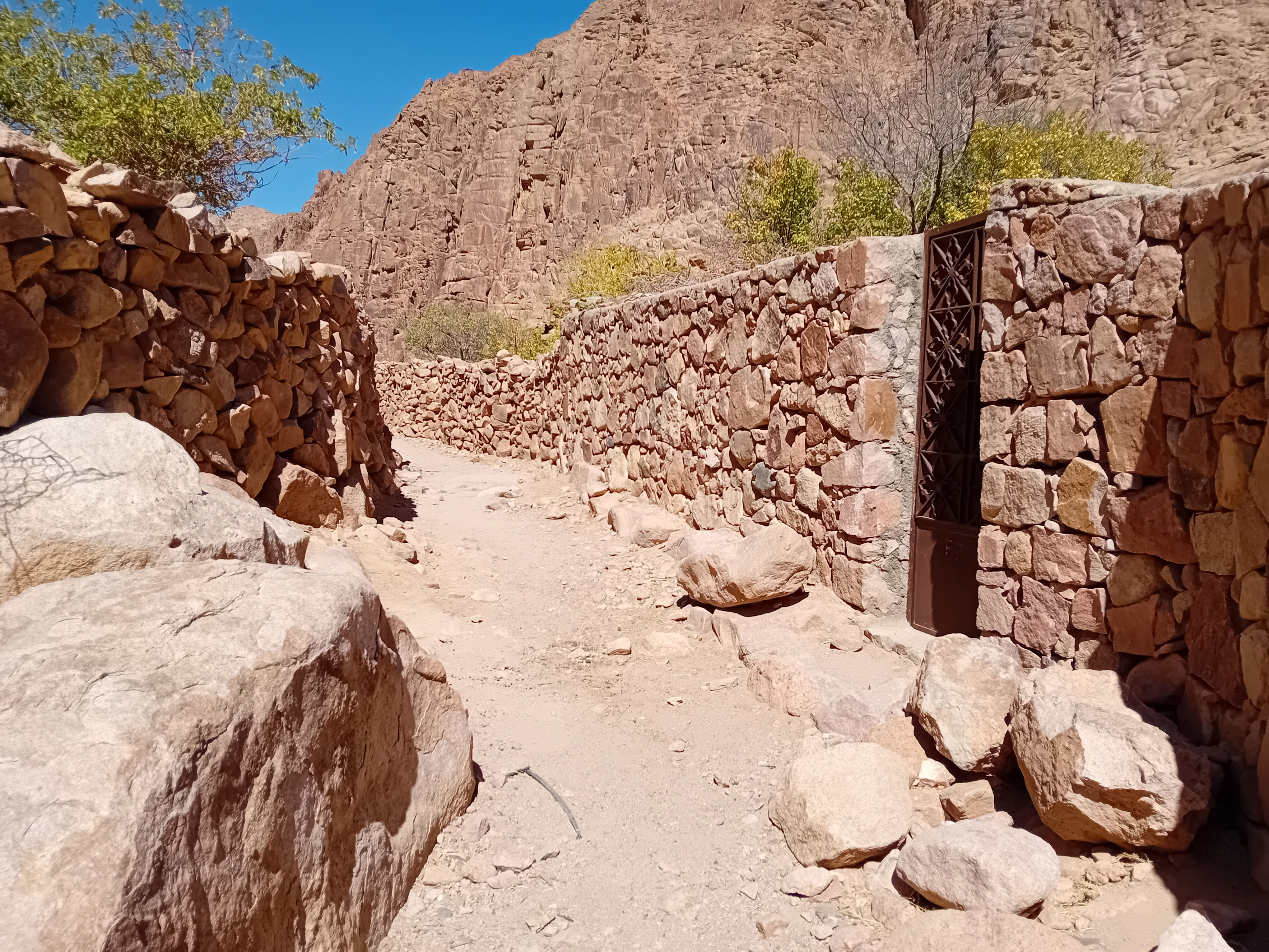 The nearest Bedouin garden from St Catherine is El Freish, a secluded and cute basin with a single garden, separated from the city by a small ridge. The basin is also called Farsh Shama' - or Farsh Abu Aluan, named after the family who owns the garden. The basin drains to the junction of Wadi Qweiz-Wadi Talaa-Wadi Itlah. The latter is a straight and long valley with many gardens and a little Greek Orthodox church next to the Cave of St John the Ladder. Wadi Itlah ends at Wadi Shaq-Tinya, a steep gully coming from the high mountains, and from here you can also get back to St Catherine via the village of Abu Seila.